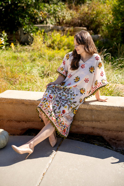The rich embroidery gives it a warm, seasonal palette. Made from a breathable cotton silk blend, it drapes gracefully without feeling heavy, making it just as suitable for lounging at home by the fire as it is for a resort getaway.