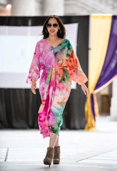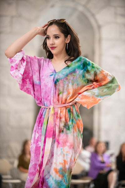 This one-of-a-kind hand-dyed rainbow caftan with sleeves , is a true statement piece blending vibrant hues with luxurious comfort. Crafted using an artistic -dye technique, each piece is uniquely dyed, making no two caftans alike.