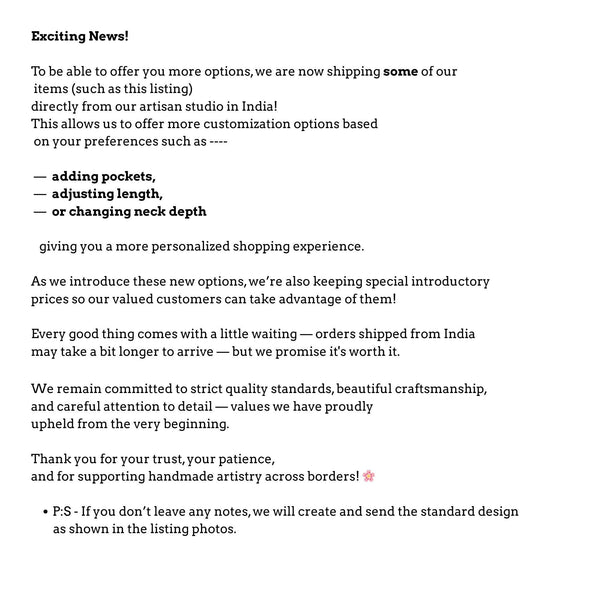 Items shipped from India may take a little longer to arrive — but every piece is made with the same strict quality standards, careful stitching, and love for detail that have been the heart of our shop since the beginning.