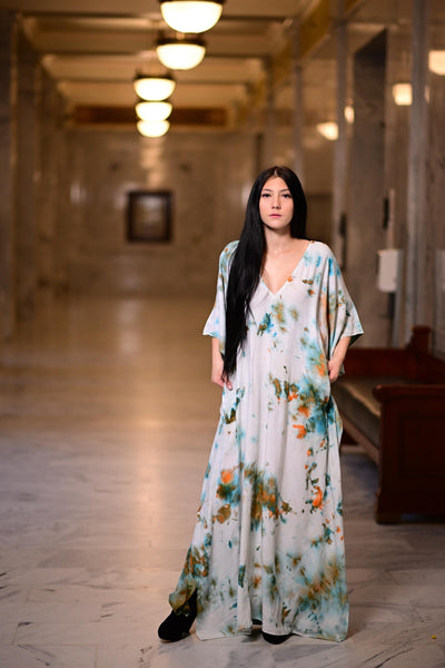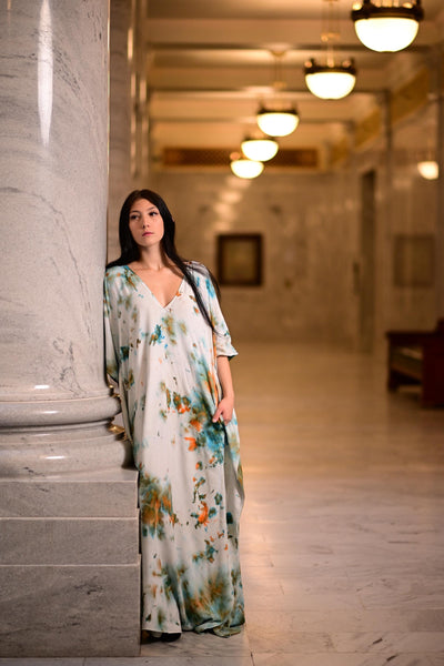 Turn heads with this stunning hand-dyed abstract watercolor kaftan, inspired by the fluid beauty of nature’s most captivating hues. This one-of-a-kind piece blends vivid splashes of cream, orange, brown, specks of aqua and grey creating a truly unique wearable work of art.